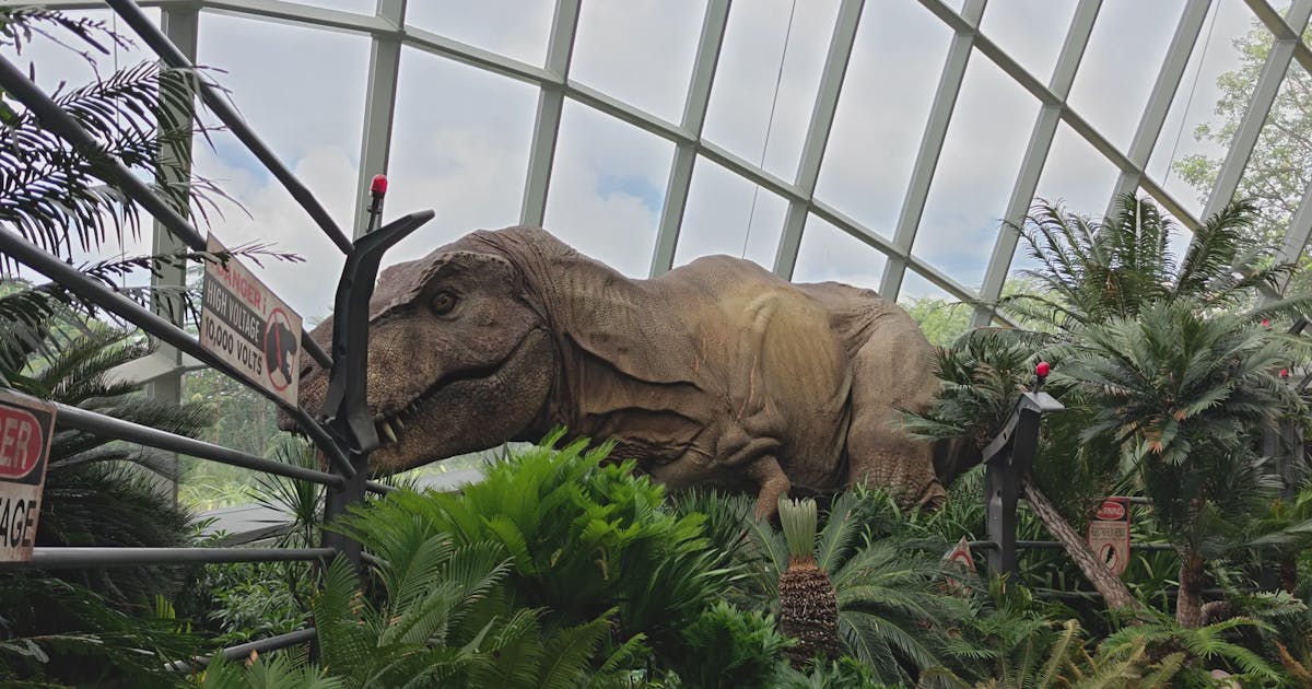 Whoosh! Leo arrives in the land of dinosaurs. He shouts, 'Look out!' as a giant T-Rex walks by.